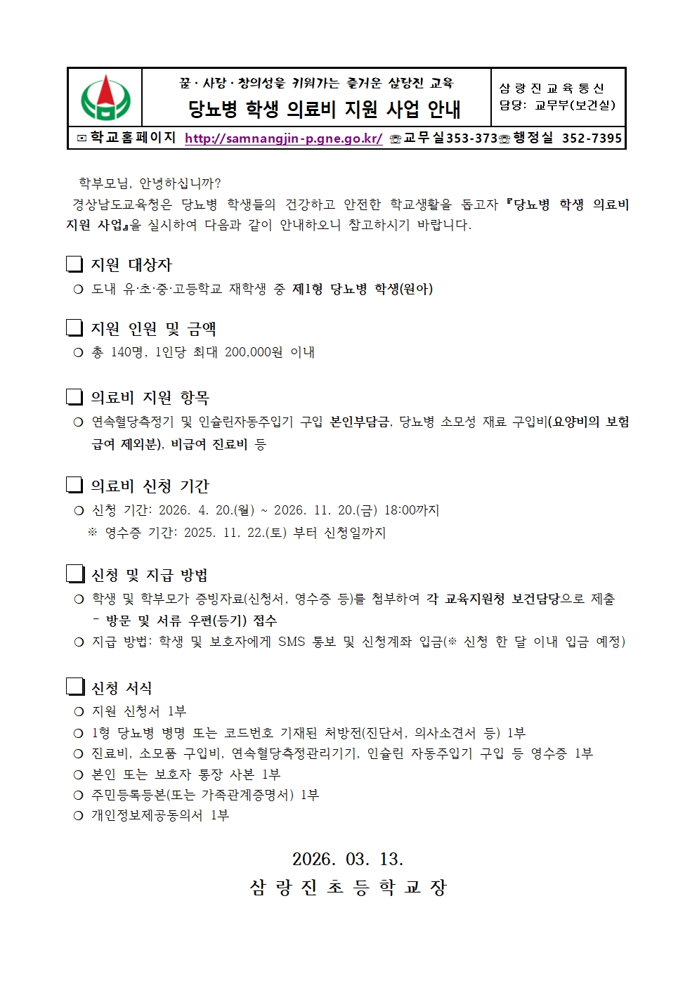 당뇨병 학생 의료비 지원 사업 안내