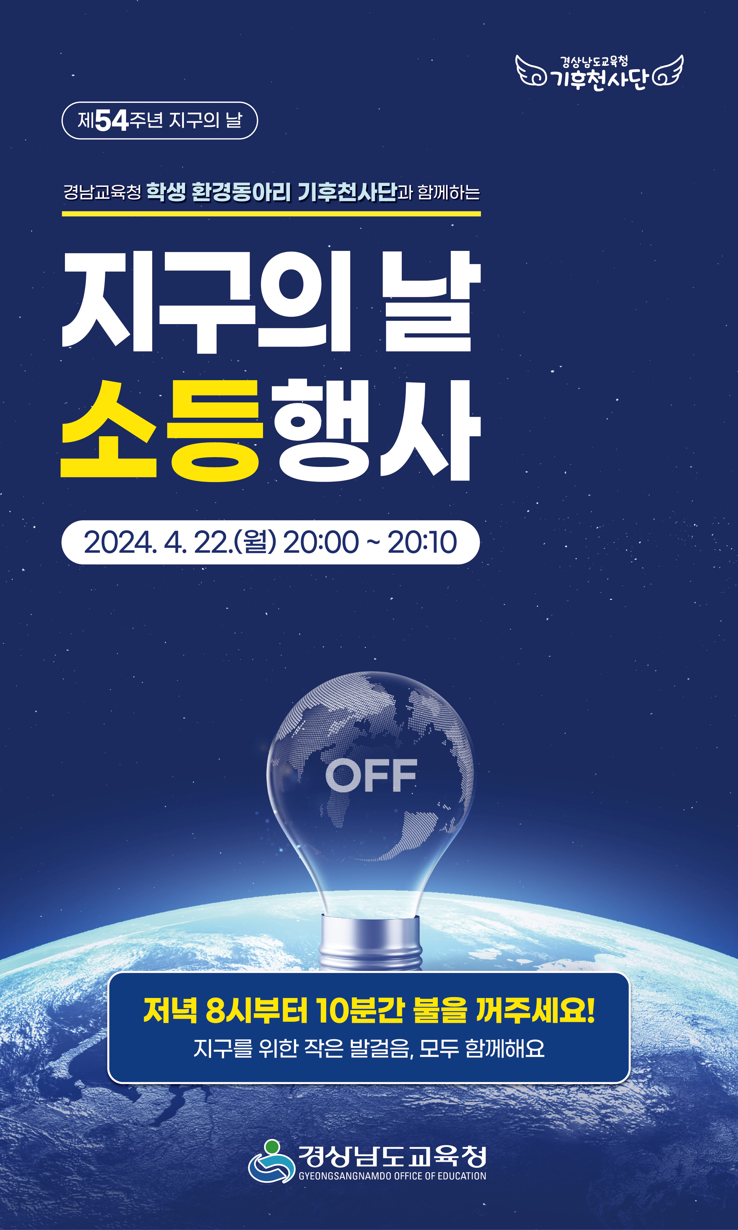우리나라에서는 매년 4월 22일 저녁 8시부터 10분간 다 함께 소등행사를 실시하고 있습니다. 경상남도교육청 학생과 학부모님들의 많은 참여 바랍니다.