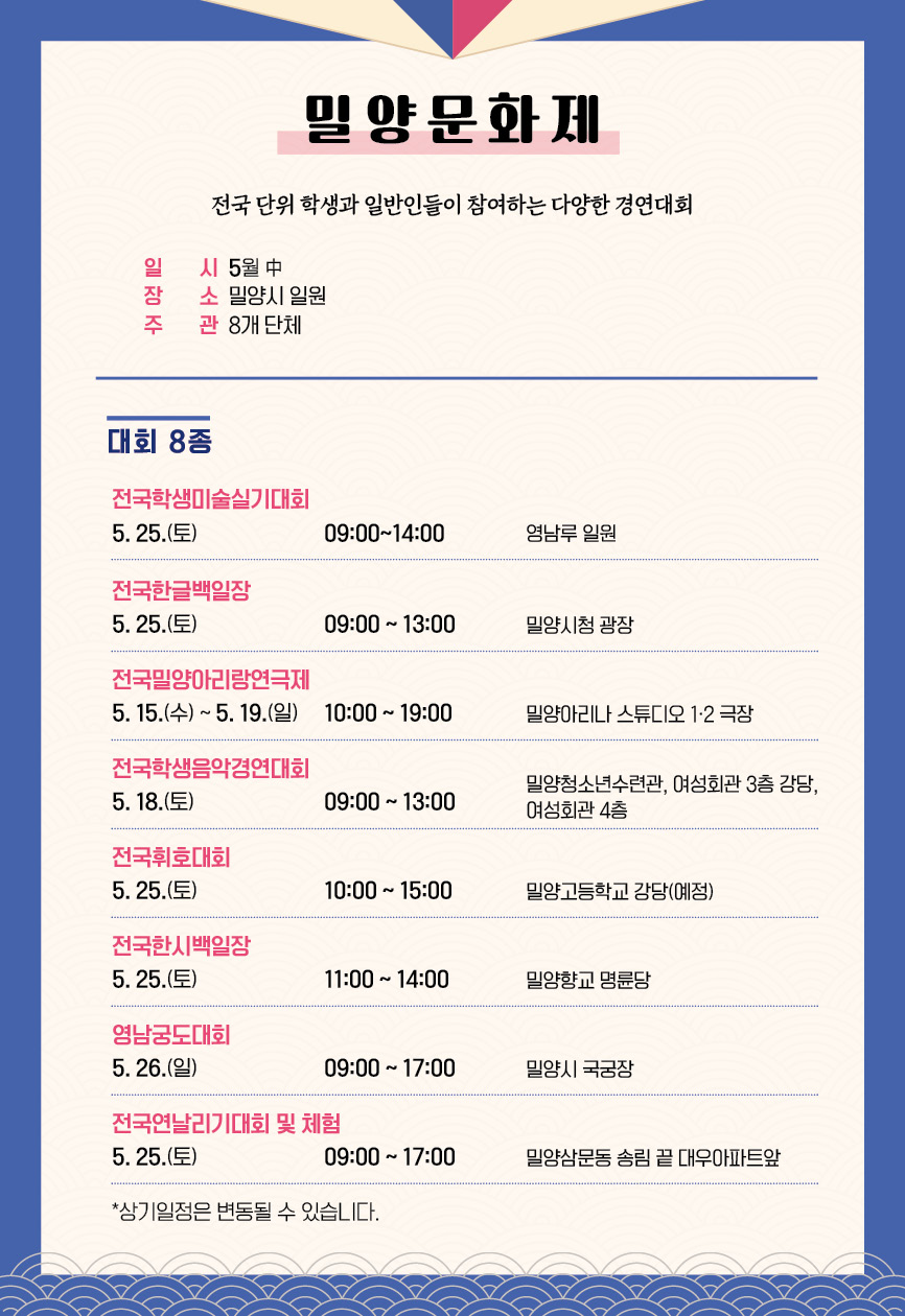 2. 2024. 밀양문화제(각종 경연대회) - 일시: 2024.5.15(수).~26.(일) - 부문별 일정 및 장소는 붙임 참조