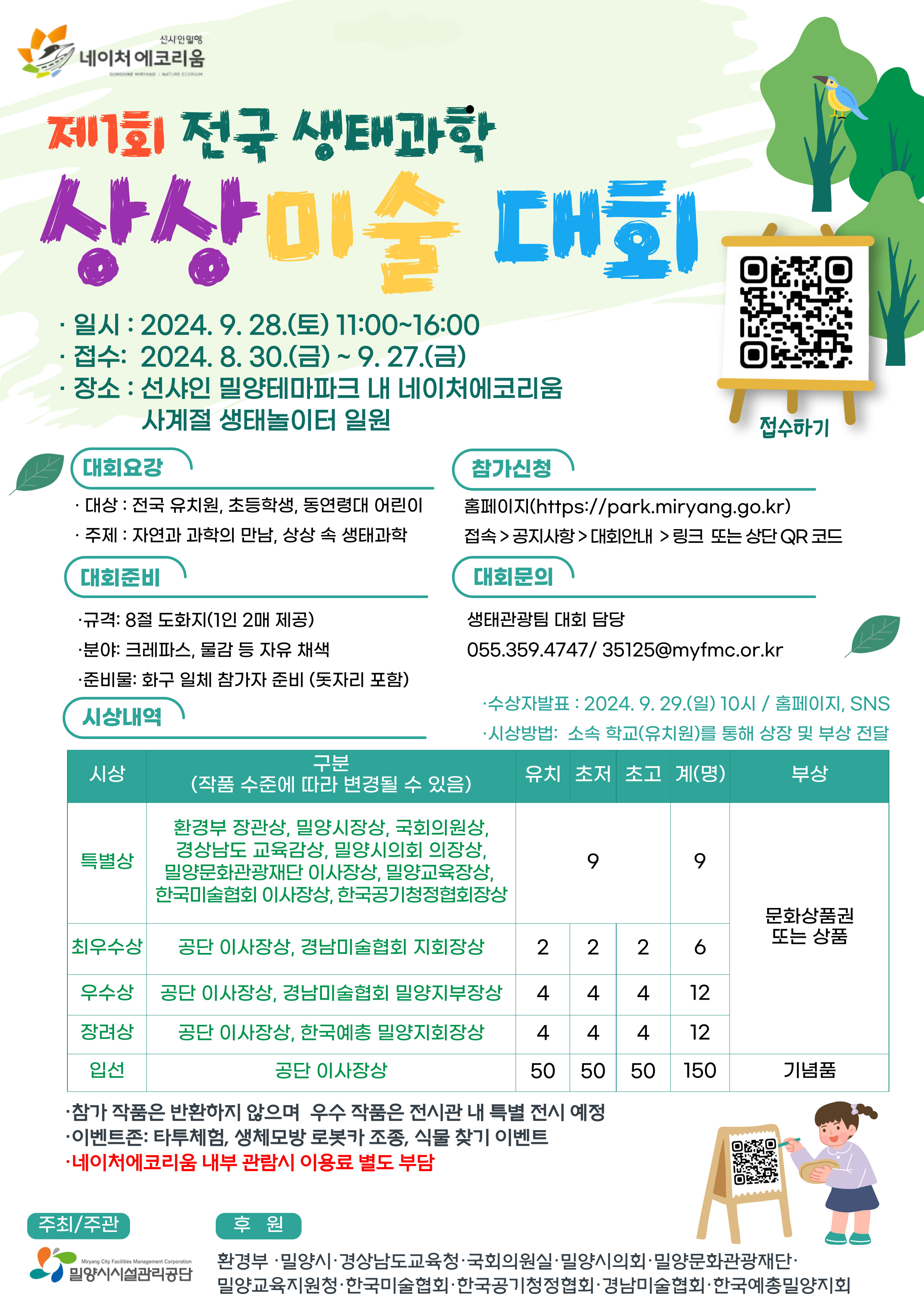 밀양시 시설관리공단에서 주최하는 <제1회 전국 생태과학 상상 미술대회>를 안내해드립니다. 많은 분들의 관심과 참여 바랍니다.